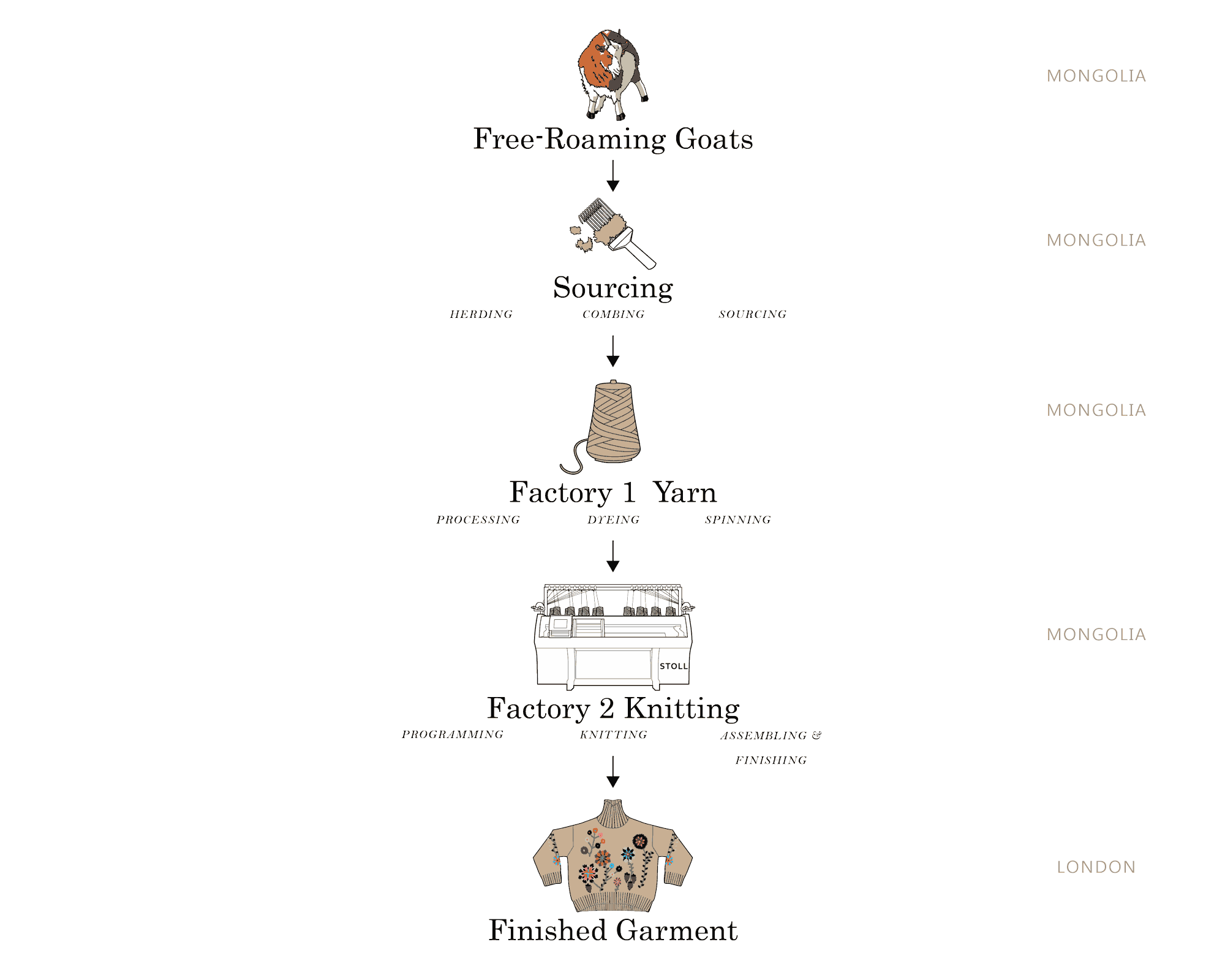 All our garments are 100% sourced and made in Mongolia. Here at Mandkhai our production is vertically integrated. This means that we can trace the fibers we use in our garments all the way back to the free-roaming goats. Read more about the goats and our cashmere sourcing.