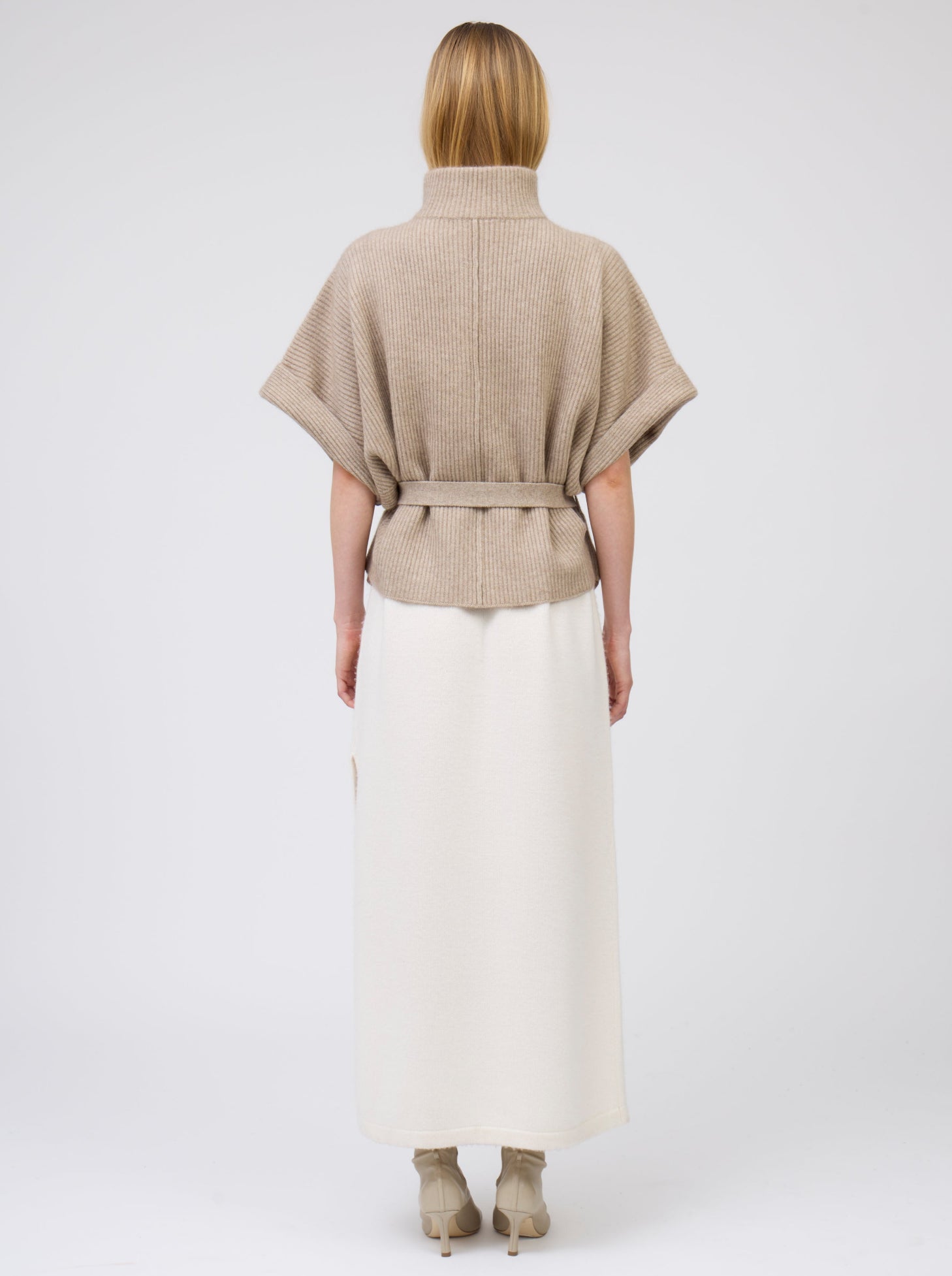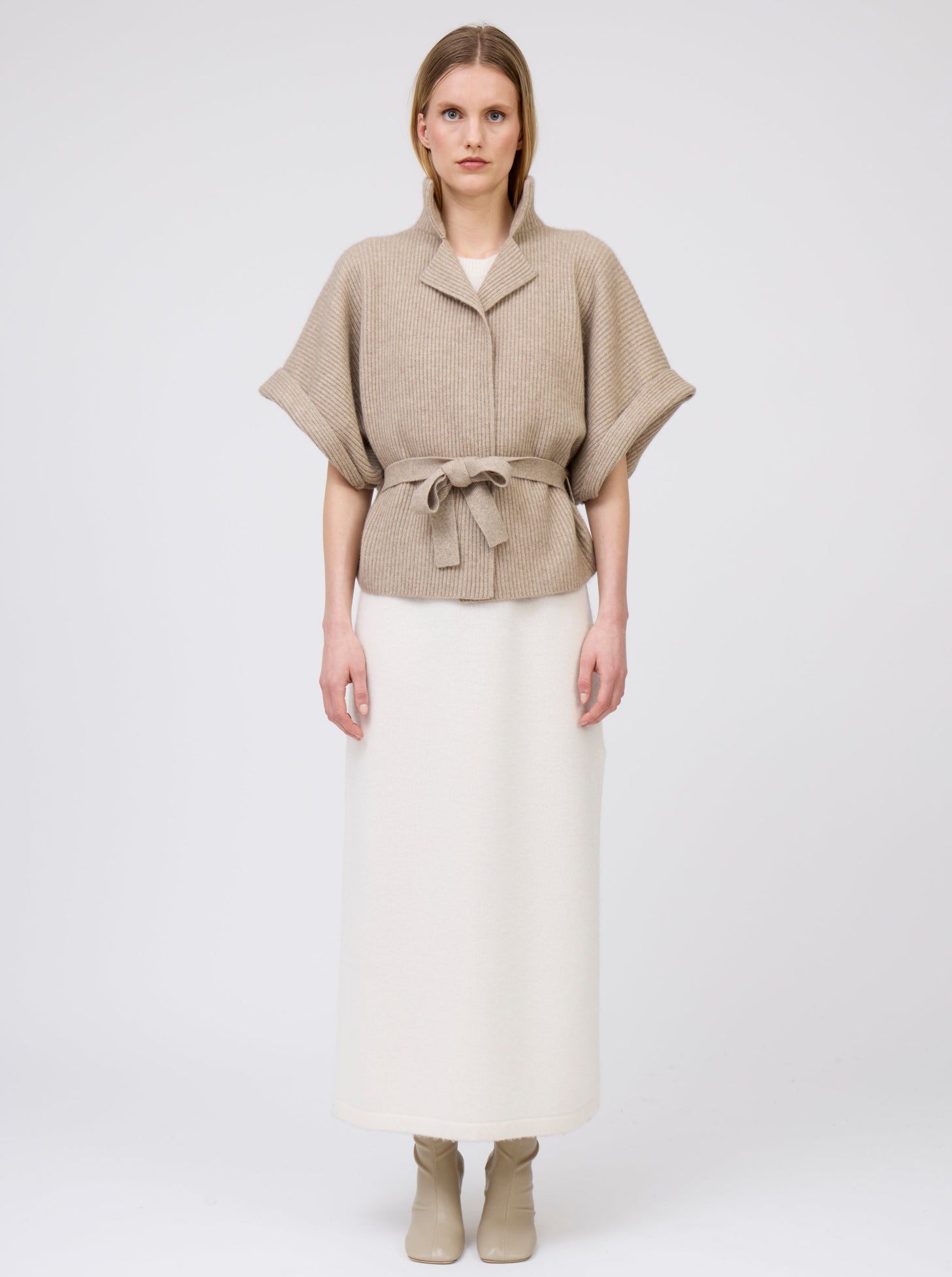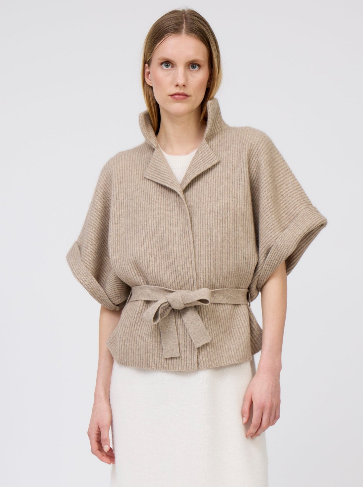 Our new style of kimono jacket in our classic shade of light brown and crafted in a ribbed knit of our pure Mongolian cashmere. It is designed as a short length, wrap-over jacket, with elbow-length, wide kimono sleeves and a matching belt to give a neat, waisted shape. Available in one size, with a versatile fit.