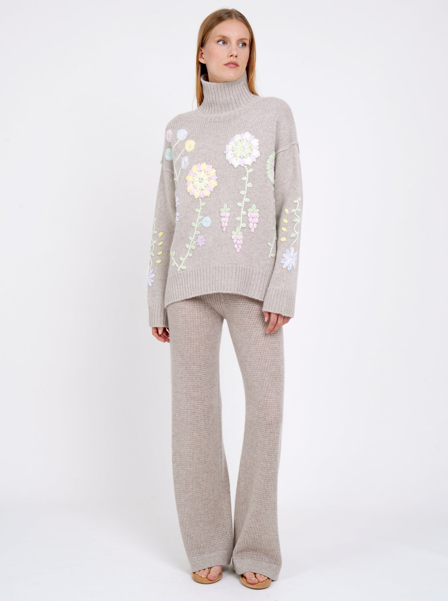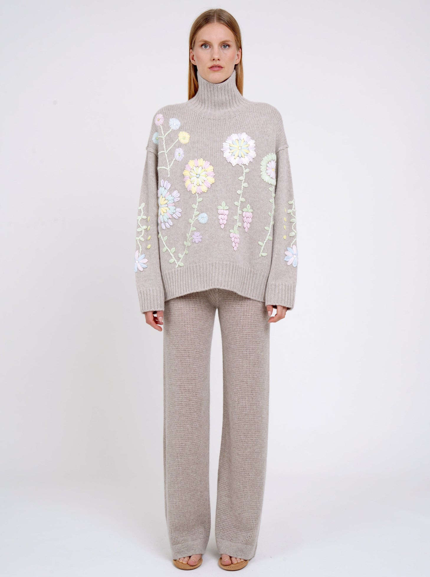 Embrace our expertise with comfort and luxury: our oversize, chunky knit roll neck jumper in our softest Mongolian cashmere. Each jumper is individually hand embroidered by our skilled artisans using our cashmere yarns, with pastel hand-embroidered flowers scattered on the new beige background. On each piece, the embroidery colours and detail may vary slightly - these are individual, wearable works of art - perfect for luxurious, wintery days and 'apres ski'!