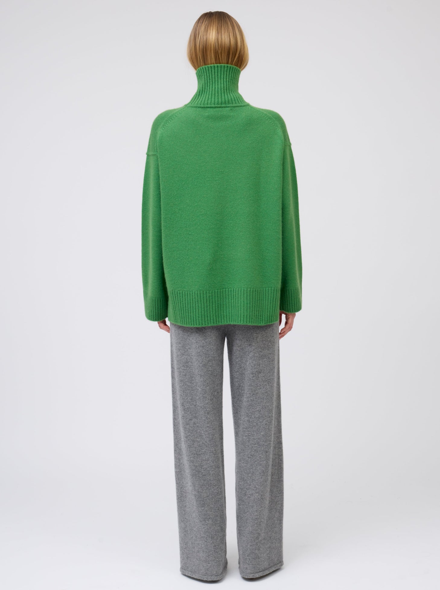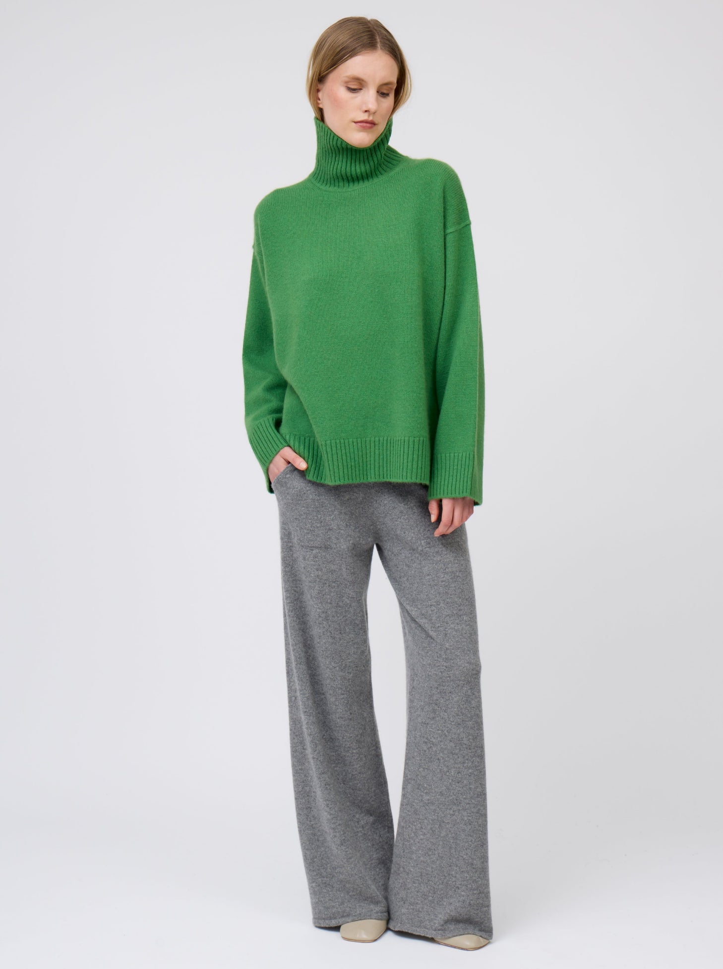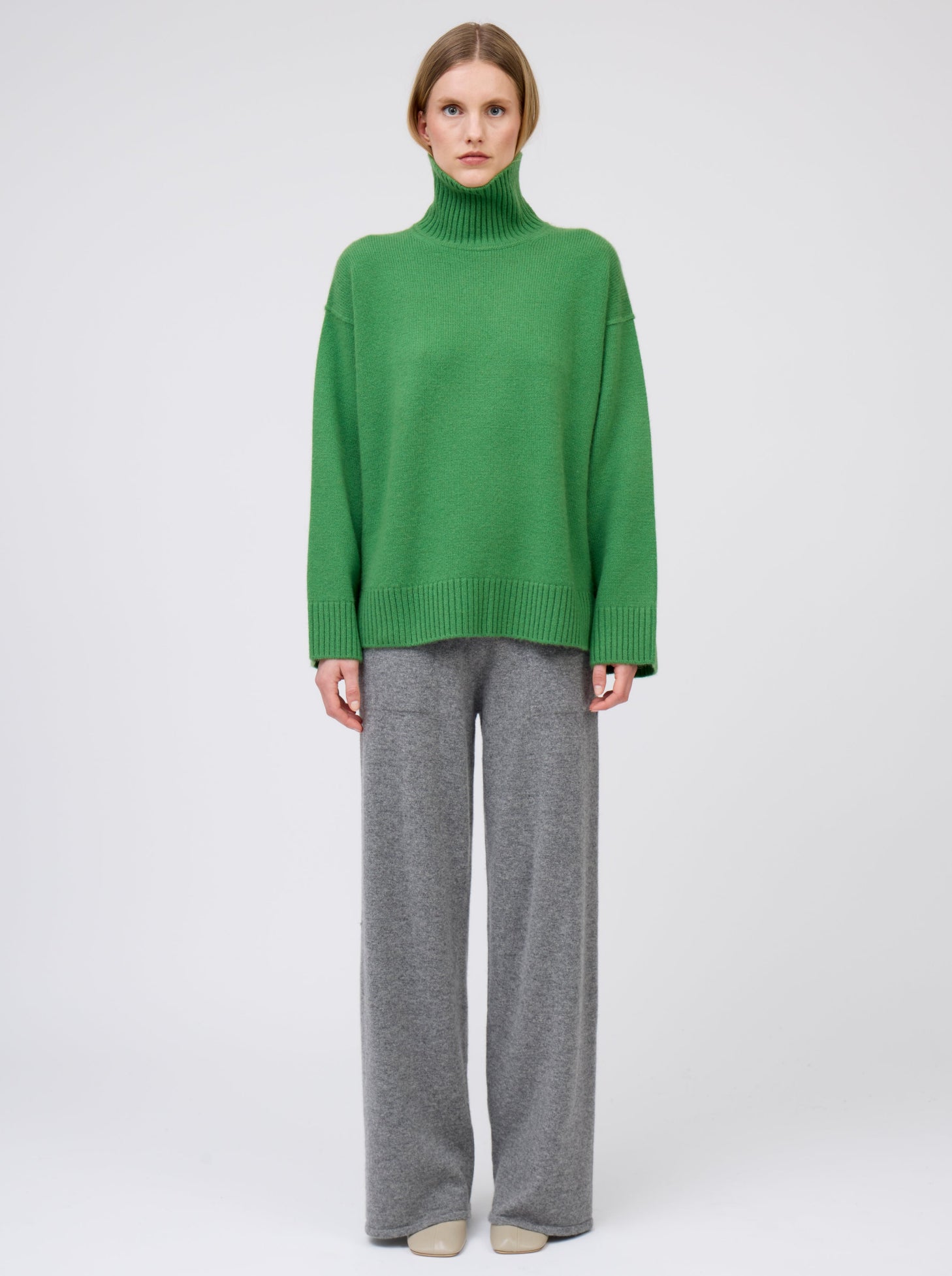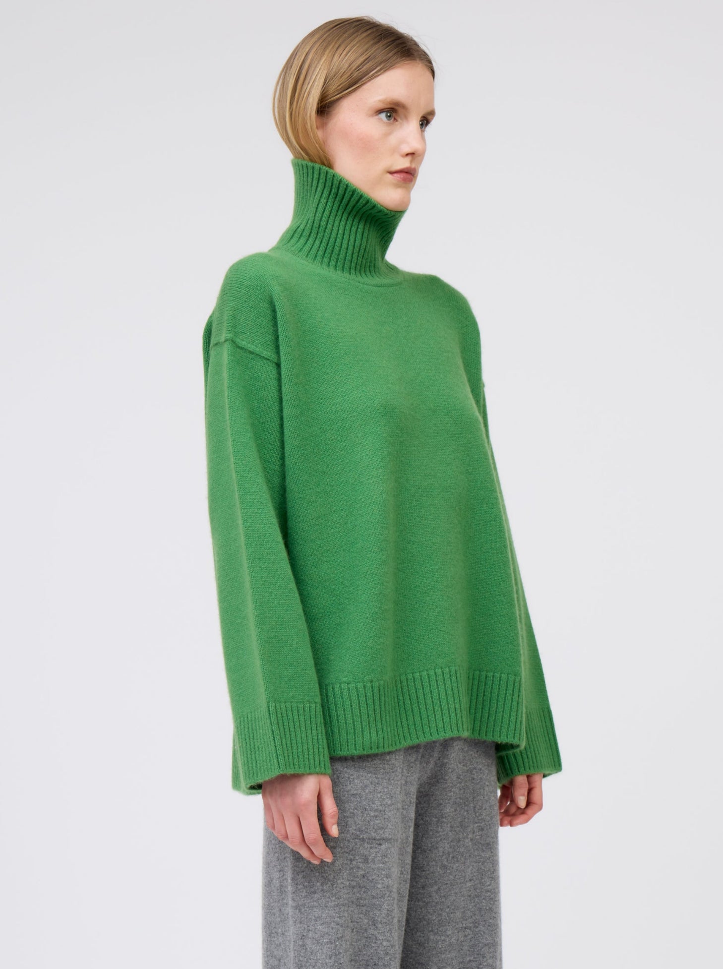 A new twist on our treasured oversized roll neck jumper in pure Mongolian cashmere: this season the jumper has a straight cut, with generous one-size fit, wide, long sleeves and a deep, ribbed hem with side slits, seen here in pine green.