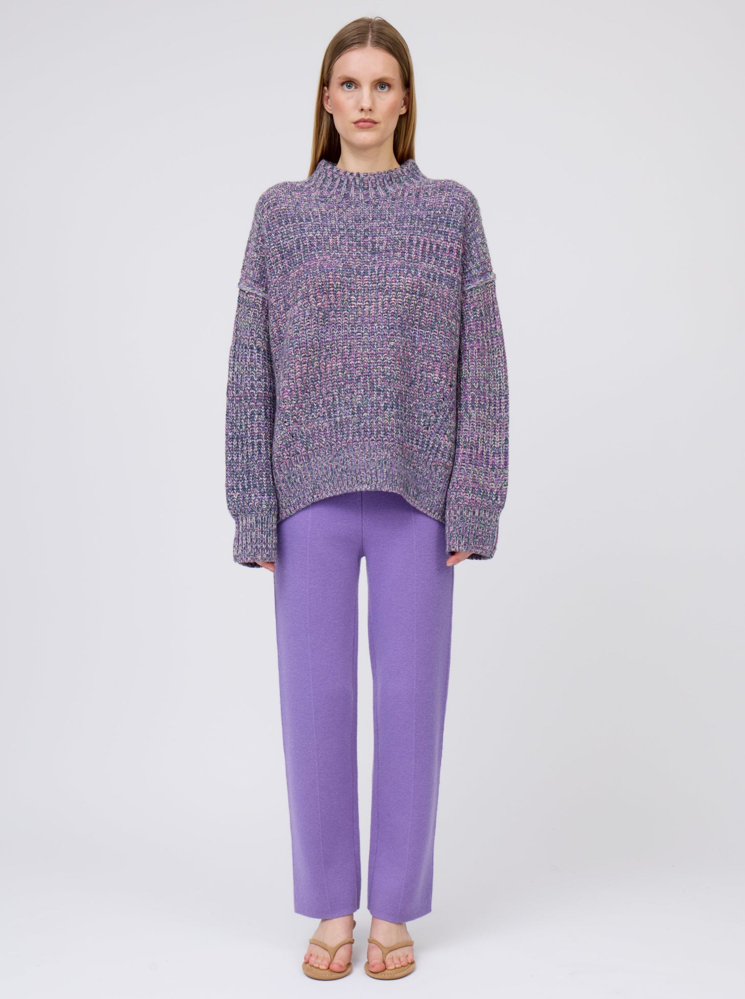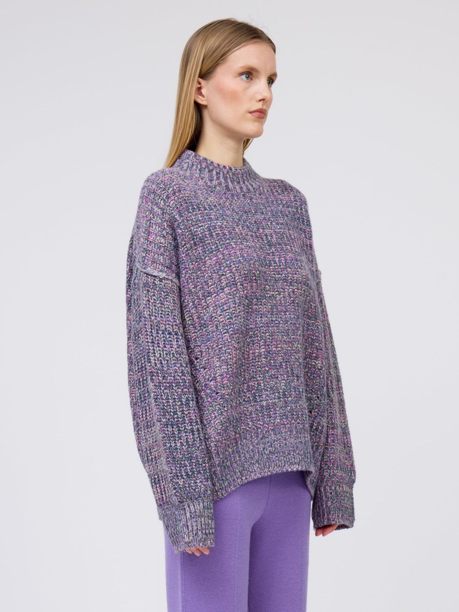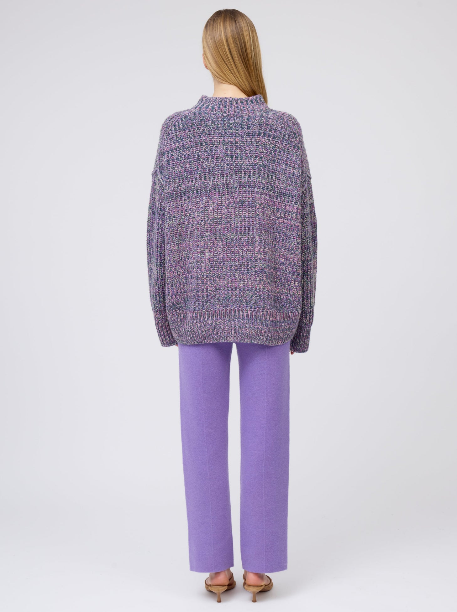 Chunky knit mock neck cashmere jumper with deep rib cuffs and hem; in a melange knit yarn of mixed colours. One size.