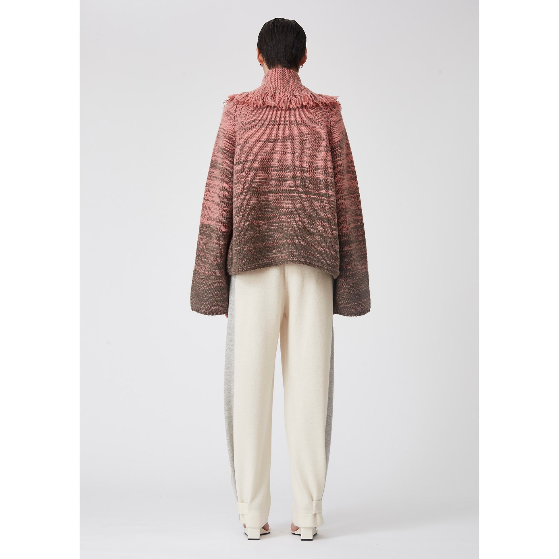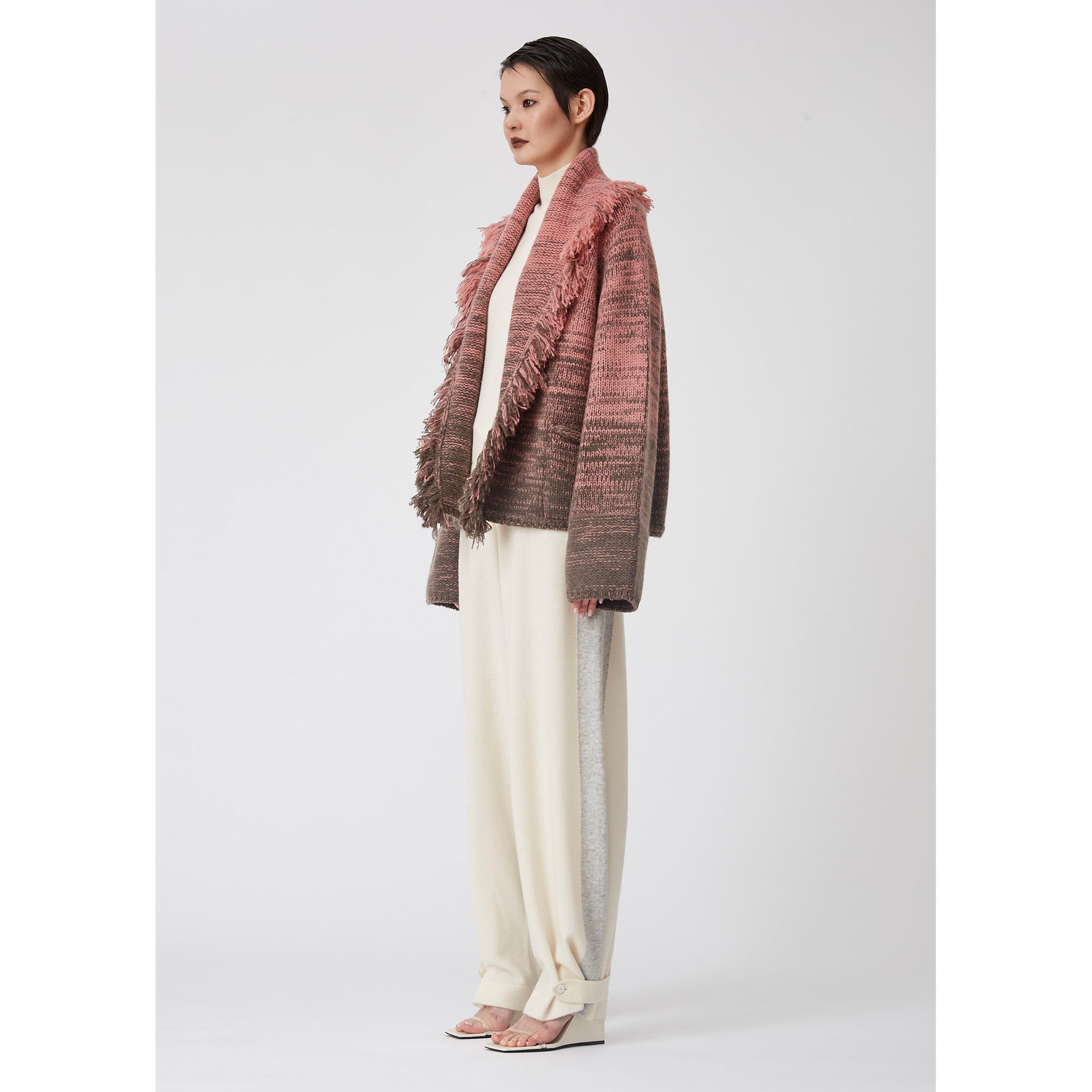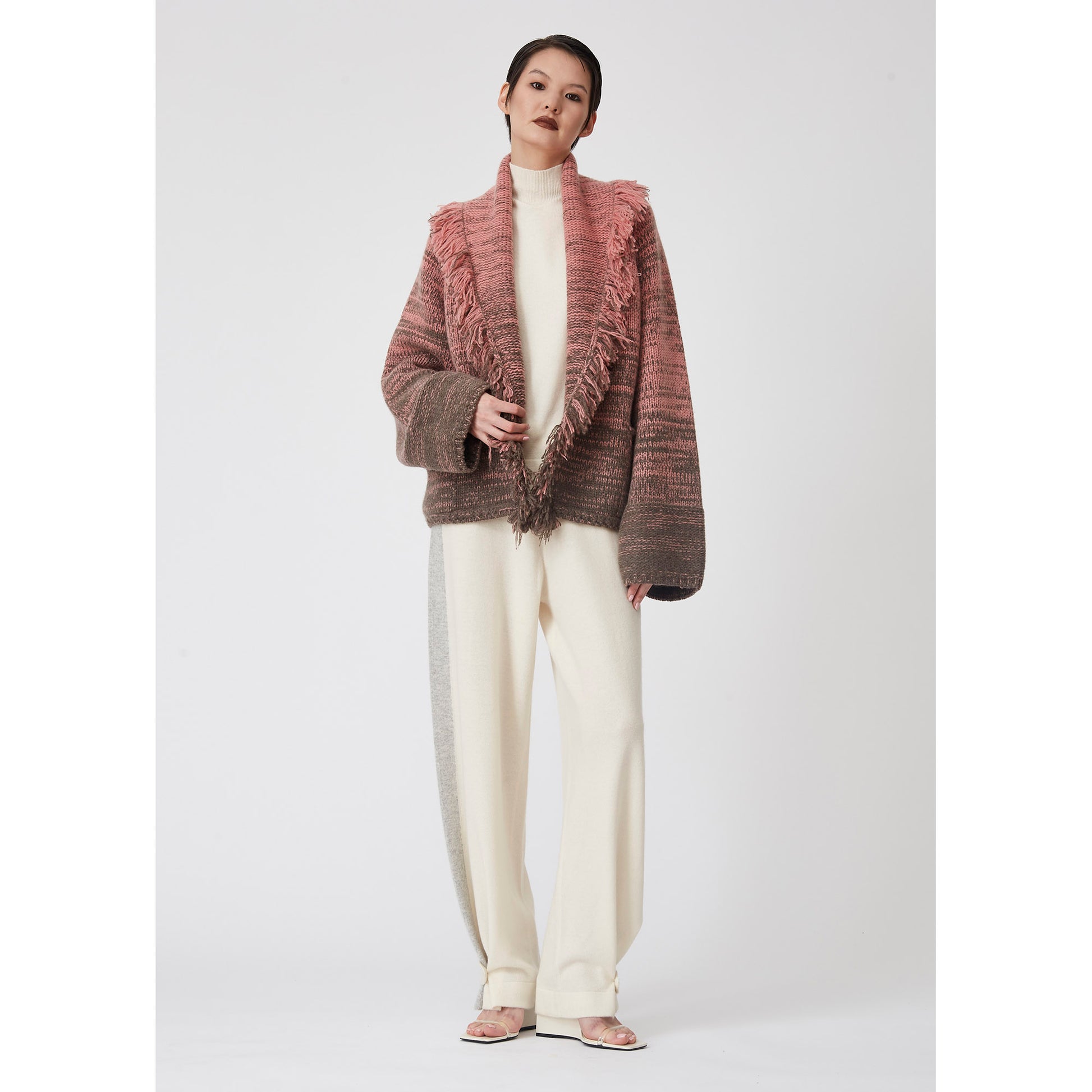 Ultra soft cashmere chunky knit jacket with shawl collar and fringe trim. Available in our blended statement colours. One size, with relaxed fit, 2 patch pockets and wide sleeves designed for a roll back cuff. Short length jacket hangs to top hip.